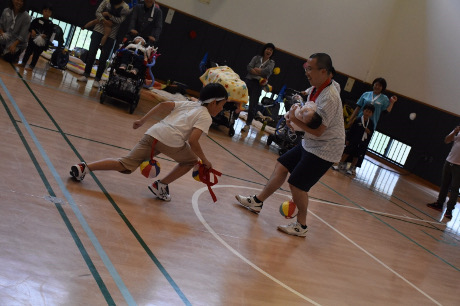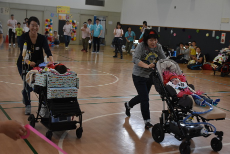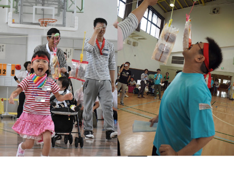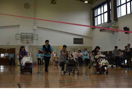 1種目目の徒競走は走れる子ども、車椅子の子ども(家族が押して走る)に分かれて競い、大人は夫婦や親子で二人三脚を行いました。