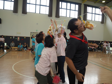 走れるこどもはお目当てのパンを目指してまっしぐら、大人もプライドにかけて必死にパンをくわえていました。(一番下手なのは理事長!)