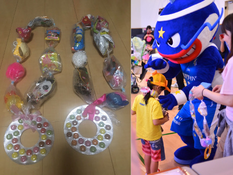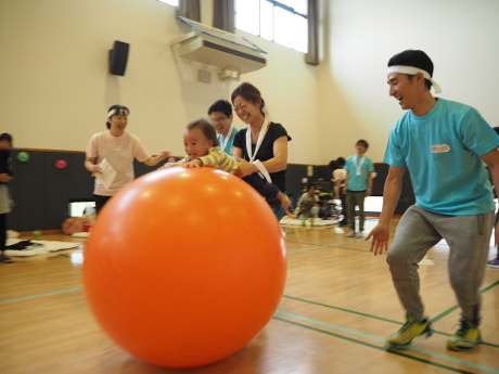 参加家族全員(子どもも大人も)がおしりに紙風船をぶら下げて奪い合い、最後まで紙風船をとられずに残ったチームが勝ちというルールで団体戦を行いました。 大人もこどもも関係なく必死に紙風船を奪い合い、会場は大盛り上がりでした。