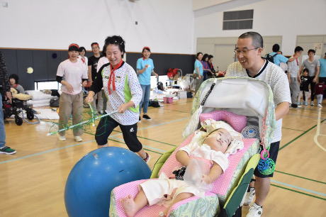 皆さん、真剣に勝つための方法を考え、車椅子をお父さんが全力で押したり、呼吸器を肩からさげて走るお母さんも!