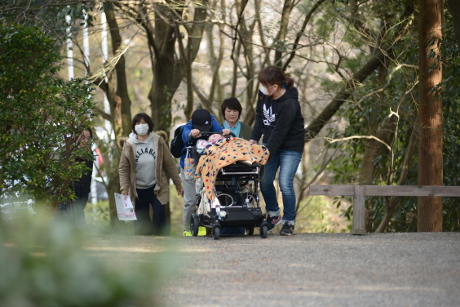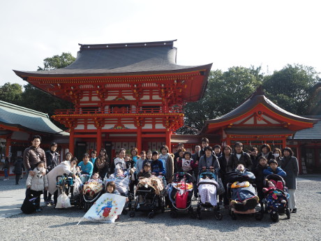 10時に集合、スタッフ23人が勧学館前の駐車場でお出迎えし、近江神宮本殿まで一緒に移動しました。 本殿では家族ごとにお参りし、集合写真をとりました。こどもと一緒におみくじを引く光景も微笑ましかったです。