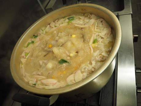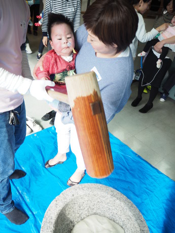 勧学館に移動して自己紹介をしてから、恒例のおもちつきを行いました。医療的ケアのある児もきょうだいもスタッフや家族と一緒にがんばって杵をもちあげてもちつきしました。 ついたおもちは家族ごとにトレイにうつして、各自で丸めて、いただきました。つきたてほかほかのおもちのおいしいこと!きょうだいたちも目を輝かせておもちを丸めて食べていました。 また、スタッフが前日から地元の食材を使って下ごしらえした特製豚汁や、BFRの行事では定番になった滋賀県名物の肉のげんさんのコロッケも美味しくいただきました。