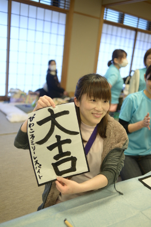 最後に書き初めをしてみんなで発表しあいました。「笑」という文字を書かれたご家族が多かったですが、 日々お祭りのように楽しく生きられたらという願いで「祭」「楽」「生」と書かれたお父さんが印象的でした。 きょうだいたちも思い思いに書いてくれました。BFRからは参加されたみなさんが、1年間笑ってしあわせに過ごせますようにと願いを込めて、 「大吉」の文字を書かせていただきました。