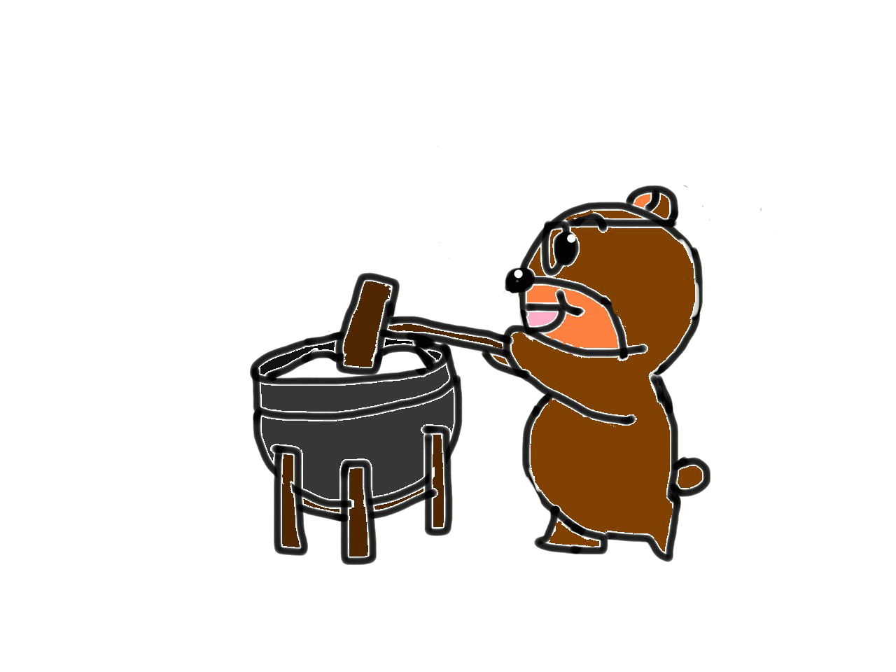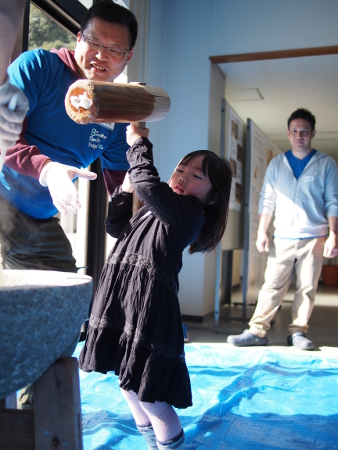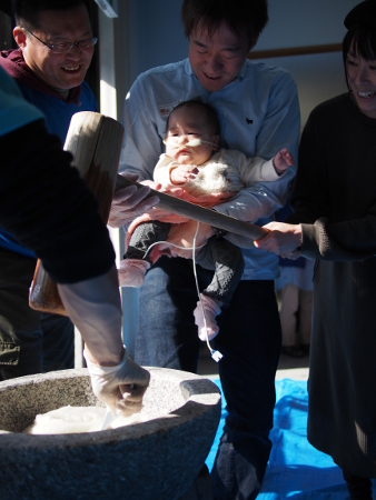 初詣の後は、勧学館の広間に集まり、おもちつきを楽しみました。 めでぃっこをだっこして家族でついたり、きょうだいが一人でがんばったり、