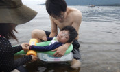 2日目は朝からメインイベントの湖水浴! 子どもたちの体に合わせて、スタッフに浮輪やうき棒をつけてもらったり、