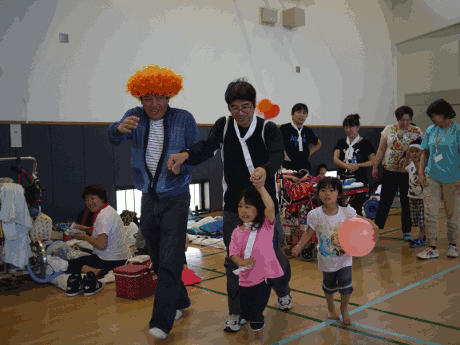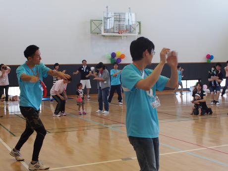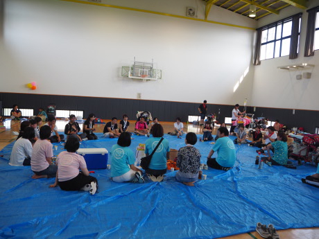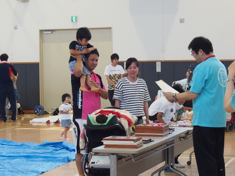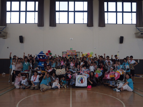 2016年6月18日(土)に野洲市なかよし交流館にて、「気管切開をしている子ども(小学校6年生まで)ときょうだい、家族が運動を楽しむことを通じて家族の絆、家族間の交流を深める」ため、運動会を開催しました。 当日は、気管切開されているお子さんとそのご家族19組63人(歩けるお子さんが7人、人工呼吸器を必要とし車いす移動のお子さんが12人)とボランティアスタッフ38人が集まりました。ご家族、スタッフ、それぞれが紅組白組に別れて協力して優勝を目指しました。