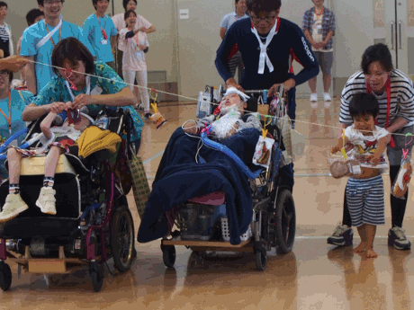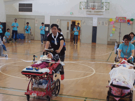 きょうだいさん対抗の2レースの後、気管切開のお子さんは車いすのお子さん対抗で2レース、歩けるお子さん対抗で1レース行い、最後に成人のご家族対抗で1レース行いました。