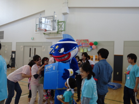 お昼休憩をはさみ、午後からは飛び入り参加していただいた滋賀レイクスターズのマグニーも加わって、第三種目の借り物競走を行いました。