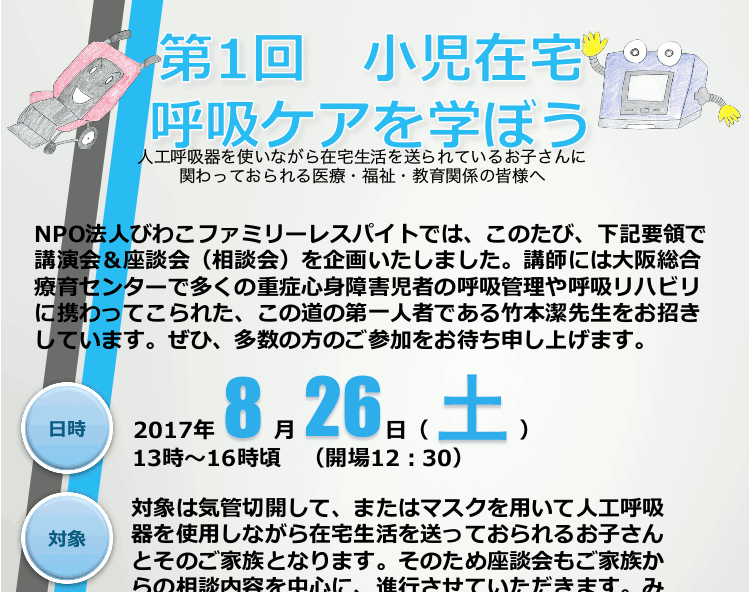 NPO法人びわこファミリーレスパイト(BFR)ではこの度、下記パンフレットの要領で在宅人工呼吸管理をされているお子さんとご家族を対象とした医療講演会を8月26日に野洲市なかよし交流館で企画しています。